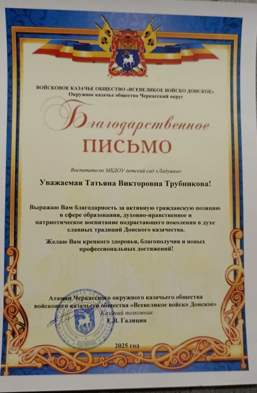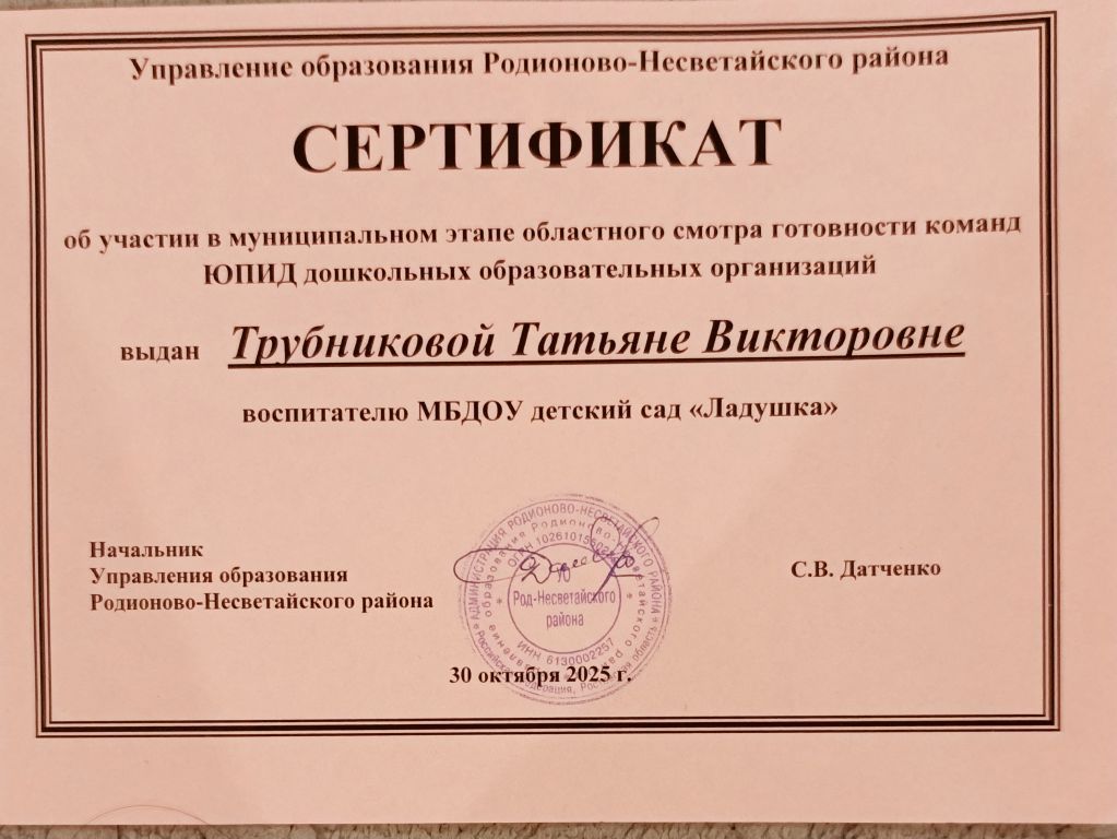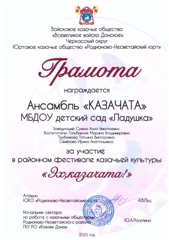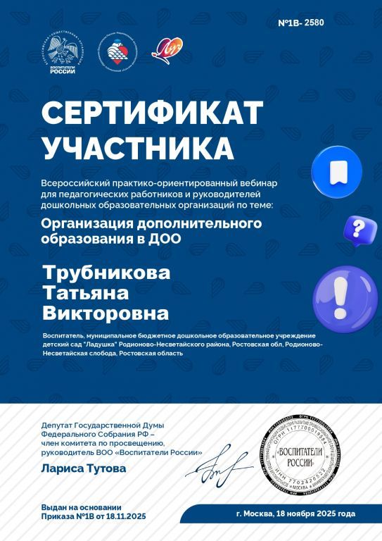 Высшая квалификационная категория в должности "Воспитатель" (2025) ; Первая квалификационная категория в должности "Музыкальный руководитель"(2025 г.)